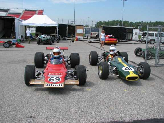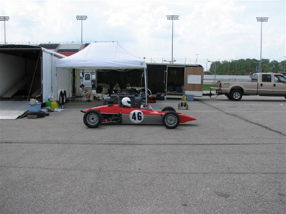When we pulled into the back parking lot of the Clarion, searching for John and Carol Arnolds rig, we discovered an ocean of LOTUS! Yup, this is the place. We did the best we could to disrupt normal parking rules and took up several spaces in and around John’s trailer and started setting up shop. The first rule of order, wander around and check out everyone else’s stuff! John had brought his 69FF to race, and a 32 F2 for display, almost ready to race but just ran out of build time. They also had transported Greg and Bonnie’s 41FB. I lowered the rear door on our trailer to show off Ross Robbins Seven, and our 69 FB. Up walked a couple of likely characters, Ralph Stechow and Kyle Kaulback and discovered that Kyle had his 61FF and Ralph had his 69FF. Oh man, that’s three 69’s at one event, is that legal??